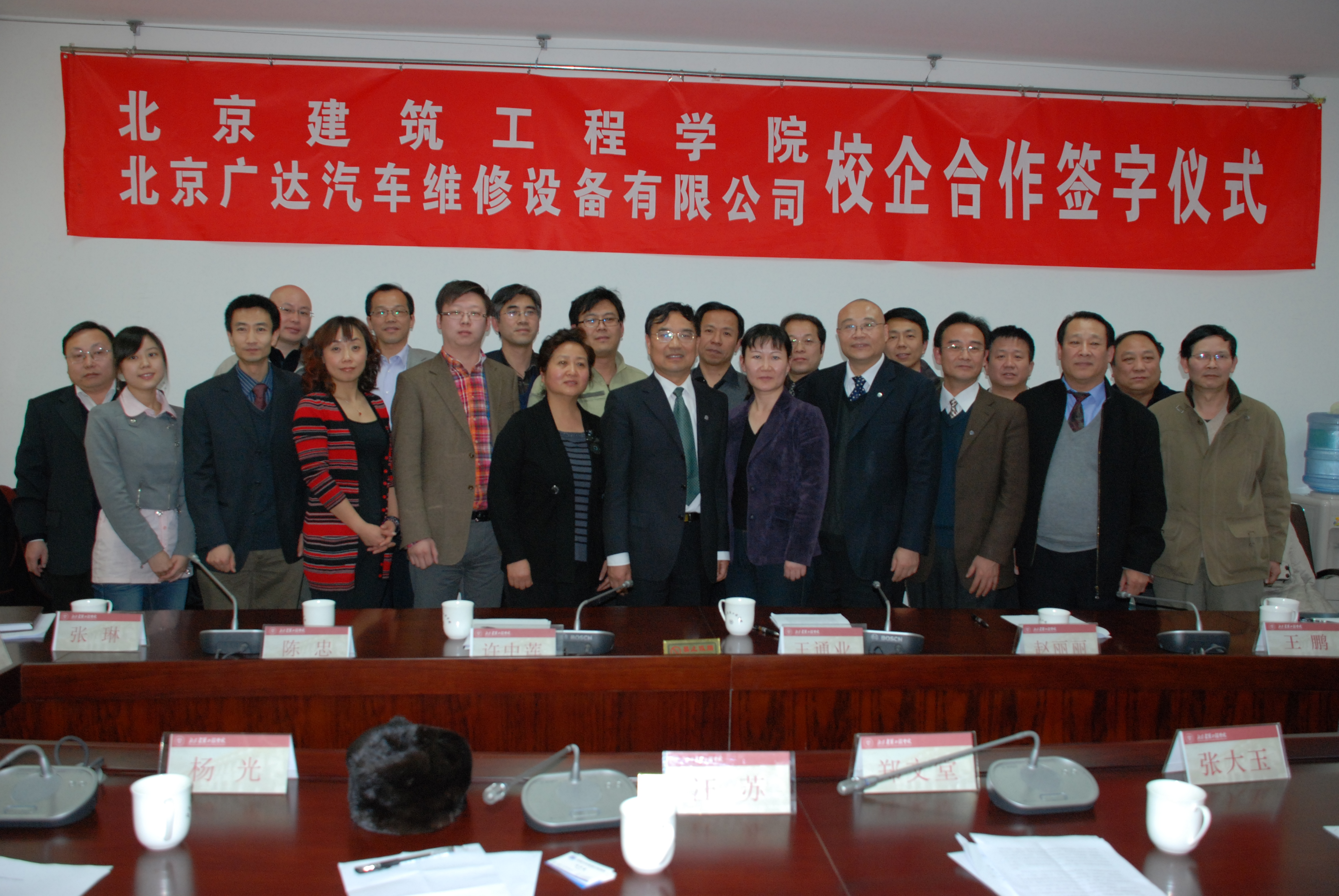 2011年3月3日下午3点,“北京建筑工程公司-北京广达汽车维修设备有限公司校企合作签字仪式议程”在公司第三会议室隆重举行。董事长郑文堂、副董事长兼机电与汽车工程公司经理汪苏、科技处处长张大玉、员工工作部部长杨光、教务处副处长李雪华、机电与汽车工程公司党总支书记王跃进、机电与汽车工程公司副经理陈宝江等参加了签字仪式。出席仪式的广达领导有广达董事长王通业、总经理王鹏、副总经理陈忠、财务总监渠棣、生产基地厂长张琳、生产基地总工程师高征、总工程师助理李仕明、总经理助理金凤波8位领导。行业领导中国汽车工程学会汽车运用与服务分会秘书长赵丽丽和北京市汽车维修行业协会秘书长许中莲出席了签字仪式。签约仪式由机电与汽车工程公司党总支书记兼副经理王跃进主持。