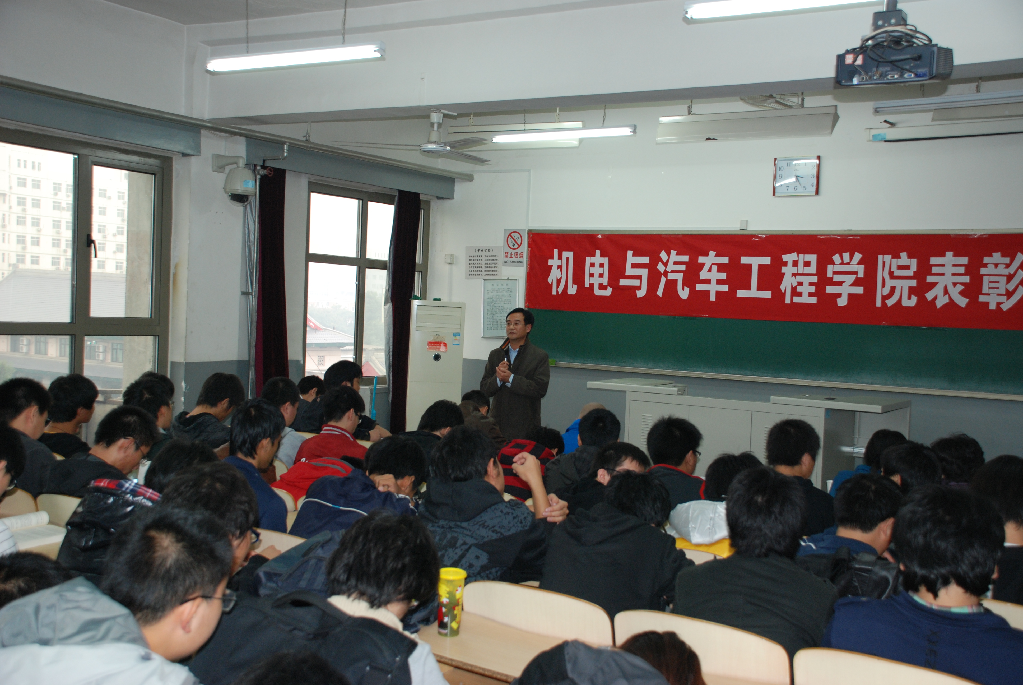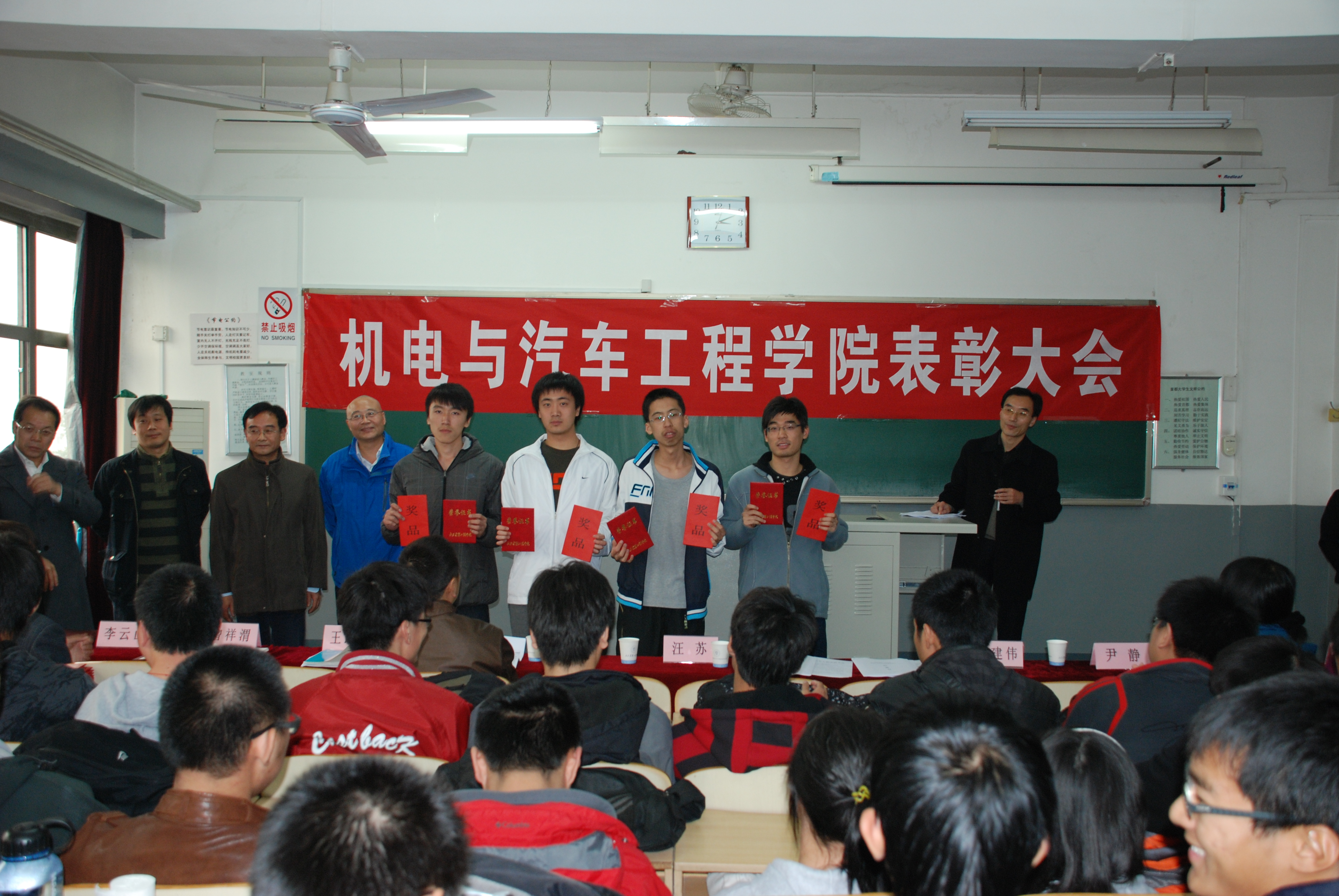 在副经理陈宝江老师宣读了《机电与汽车工程公司关于给予王建治、沈鹤群等员工表彰的决定》后,获奖同学伴着同学们羡慕的目光走上领奖台领取了奖状和奖品。