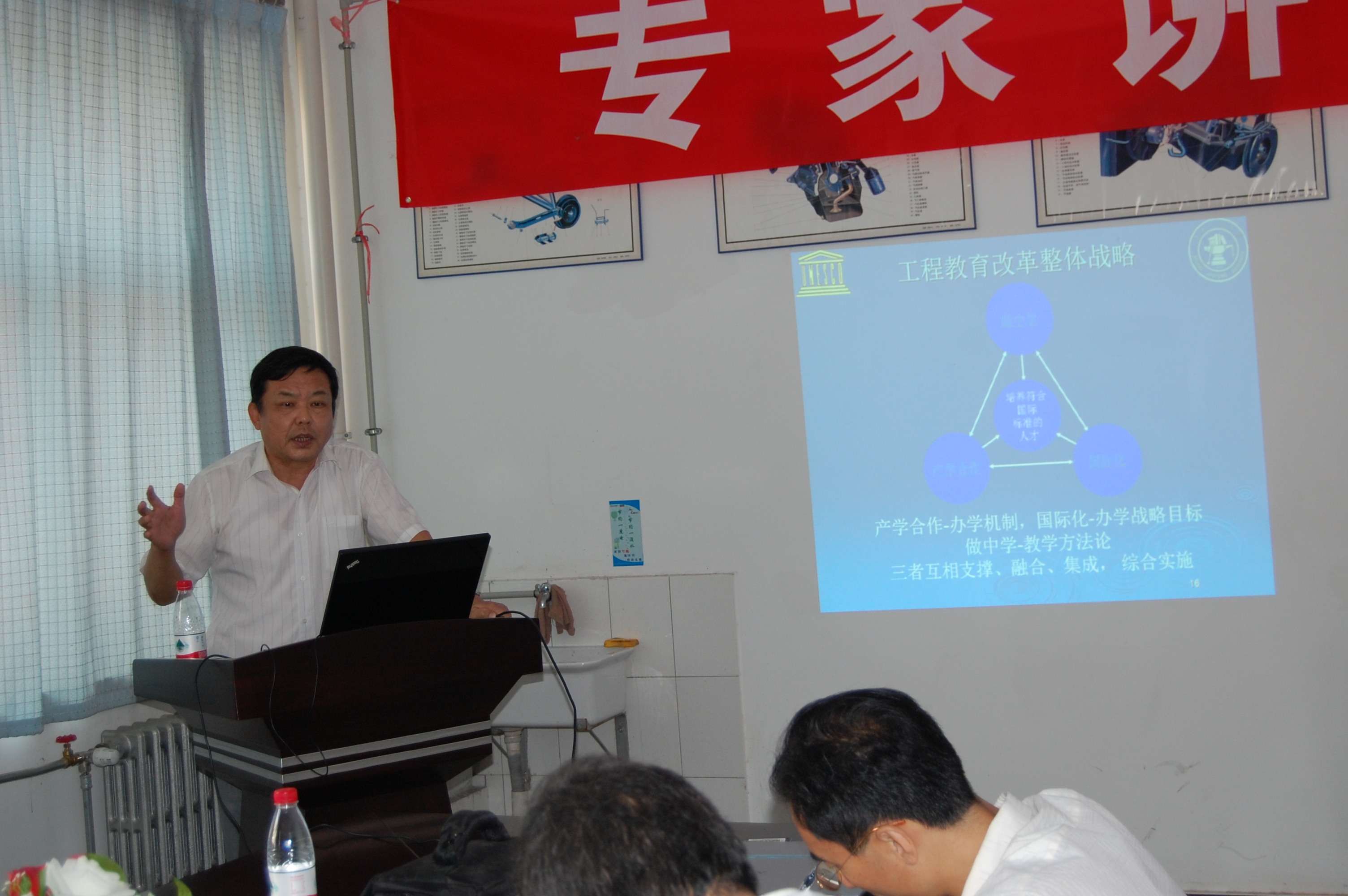 两名09员工向与会老师展示了利用暑假时间在北京石油机械厂进行项目进展情况,公司党总支书记王跃进教授向与会老师介绍了公司正准备实施的“创新型人才培养实施方案(计划)”,查教授针对公司现有的基础、前期已经开展的若干尝试工作,提出了针对性的意见和建议。他向全院老师详细解读了CDIO十二条人才培养标准以及国内外高校的实施情况,并从国际视野的角度分析了国内工程人才的培养现状,提出了“做中学”、“产学合作”与“国际化”三大战略。