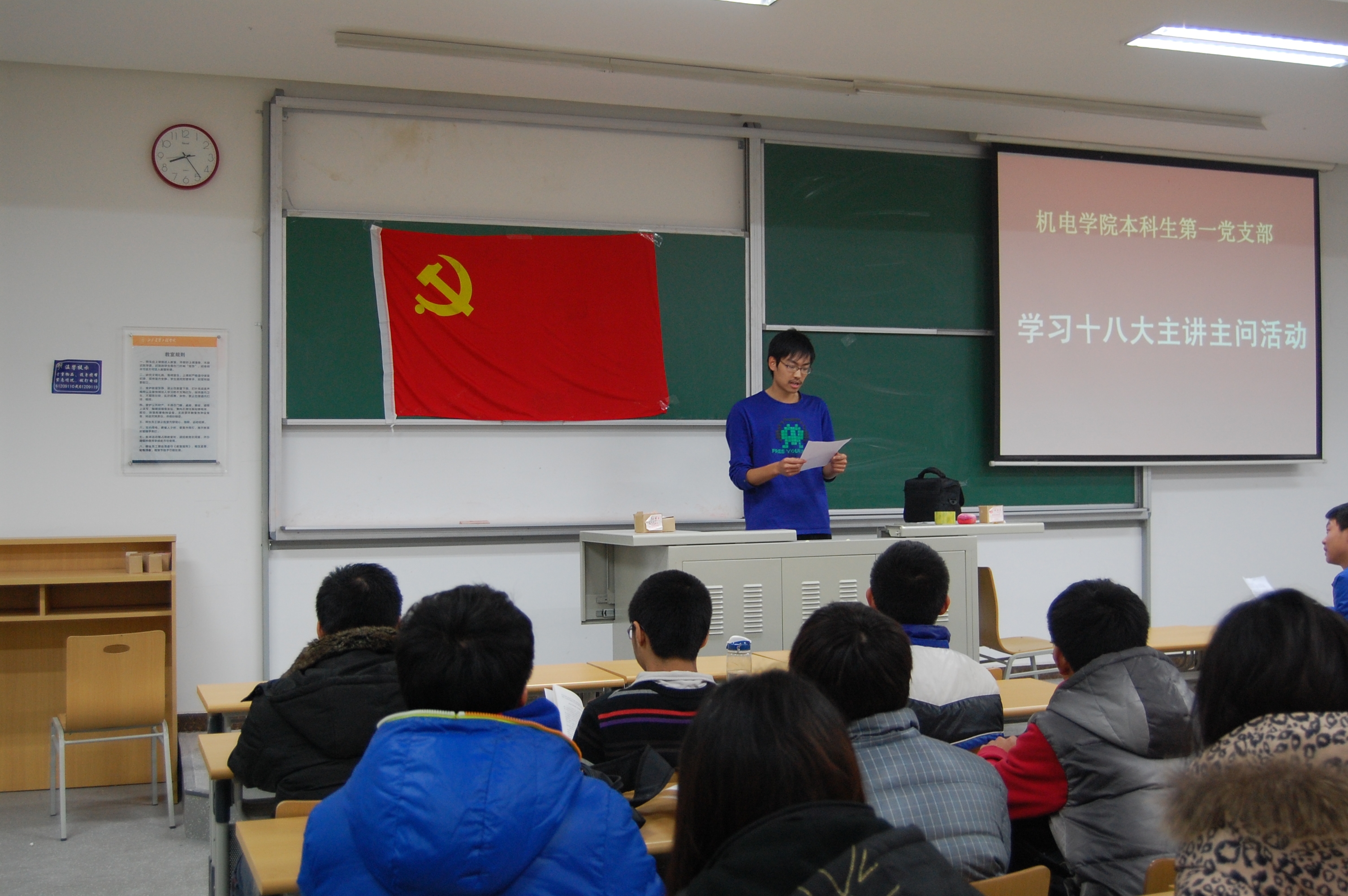 本科生第一公司党支部,12月6日晚组织全体党员和入党积极分子在基础楼D座112教室开展了学习十八大“主讲主问”活动,共有教师党员、员工党员和入党积极分子52人参加。支部七名员工党员作为主讲人,入党积极分子为主问人。主讲同学都对如何学习党的十八大精神提出了自己的看法和感受,内容涉及军队建设、党风廉政建设、中国未来的发展道路等各个方面,主问同学也分别从不同的角度对主讲同学进行了提问。最后,选举员工党员工业111班田济同学作为主讲人,代表williamhill英国威廉希尔本科生第一党支部参加更上一级的主讲主问活动。为更好宣传十八大精神,促进同学学习十八大的热情,党支部组织支部党员观看了爱国主义影片《1942》。电影使党员受到极大震撼,纷纷表示要不忘历史,增强党性,好好珍惜当前幸福美好生活,努力学习,为祖国的建设贡献自己的力量。