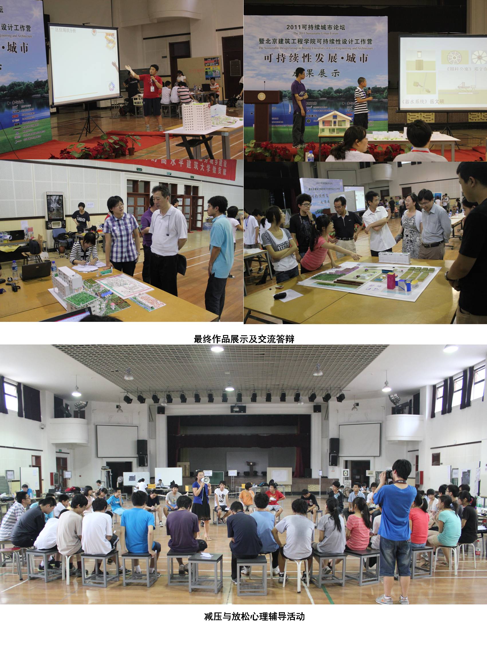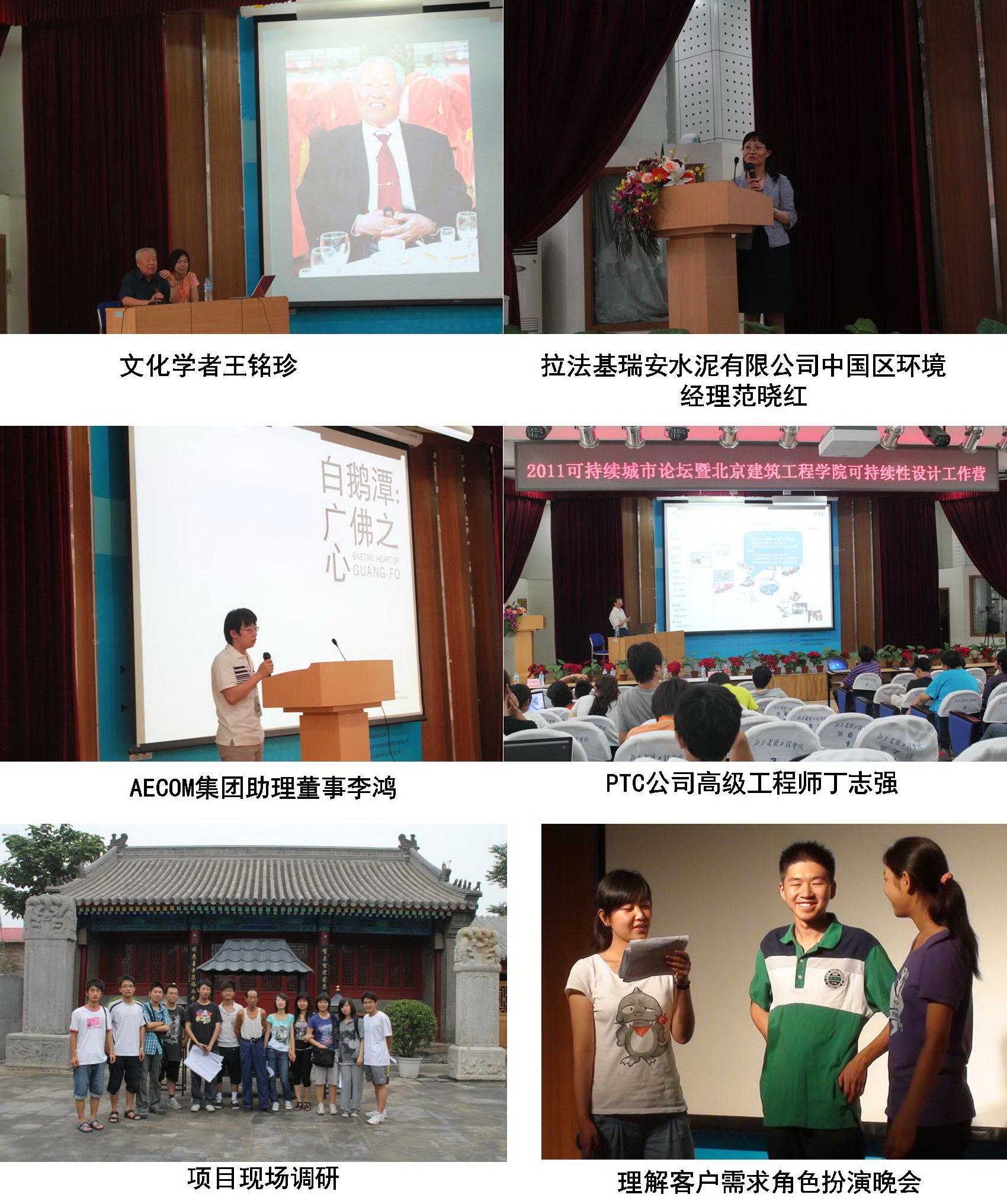 在7月12日—13日上午的2011可持续城市论坛上,北京工业设计促进会专职副理事长、北京工业设计促进中心副主任、2011北京国际设计周项目主管宋慰祖先生做了题为“设计北京、善意设计”的报告、“绿色金属铝合金助力可持续创新设计”、美国安永会计师事务所气候变化与可持续发展部门经理张有为做题为“建筑使用过程碳盘查的方法与项目分享”的报告、威卢克斯中国有限公司设计总监郭成林做题为“威卢克斯欧洲可持续建筑实践MODEL HOME 2020”的报告、公司环能公司经理李德英教授做了“节能建筑专题报告”、拉法基瑞安水泥有限公司中国区环境经理范晓红做了题为“致力于成为中国水泥行业可持续发展的典范”的报告、AECOM助理董事李鸿做了题为“AECOM的可持续城市发展探索”、联合国教科文组织产学合作教席主持人查建中教授做了“产学合作教育” 专题报告、文化学者王铭珍老先生做了“宣南文化”专题报告、PTC公司高级工程师丁志强做了“计算机辅助设计的新纪元”的报告,报告人与同学分享了行业和业界最新的可持续理念和项目实践。