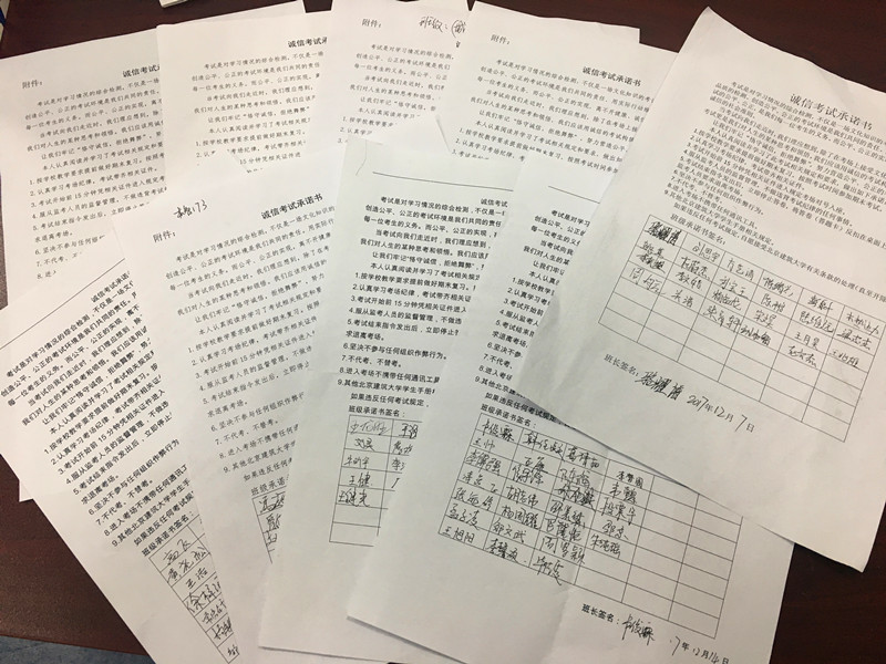 公司成立了诚信考试宣传教育工作组,制定并印发了《williamhill英国威廉希尔开展“文明考风 诚信考试”主题团日活动的通知》,采取了一系列措施,开展了多项活动。一是多渠道宣传,营造氛围。制作悬挂了“严肃考风考纪,树立优良学风”横幅,在公司楼树立“文明考风 诚信考试”警示录,在公司微信平台上发布《诚信考试倡议书》。二是公司专门召开班主任、辅导员会议要求,期末考试前,各班级要召开一次“文明考风 诚信考试”主题教育活动,对员工进行严肃考风考纪教育,告诫员工要知法守法,自觉遵守考试纪律。三是组织各团支部开展了“文明考风 诚信考试”主题团日活动,加强教育。各团支部开展的活动形式多样,观看反面教材的视频和照片使同学们深入了解了考试作弊带来的危害;活动中同学们相互分享对“诚信”和“考试”的看法;班长或团支书宣读诚信考试承诺书,每个同学都在诚信考试承诺书上郑重地签上了自己的名字,承诺严格遵守校纪校规、诚信考试;辅导员带领员工重温员工手册中有关考场规则及违纪处分管理规定等内容。四是加强巡考力度,加强考试管理,严肃考风考纪。由公司领导班子和系主任组成巡考小组,深入各考场进行巡查,对考场环境、考场纪律、考场秩序等仔细检查、严格把关,并督促每个监考人员要认真负责,杜绝违规作弊现象的发生,确保公平、公正的考试环境。