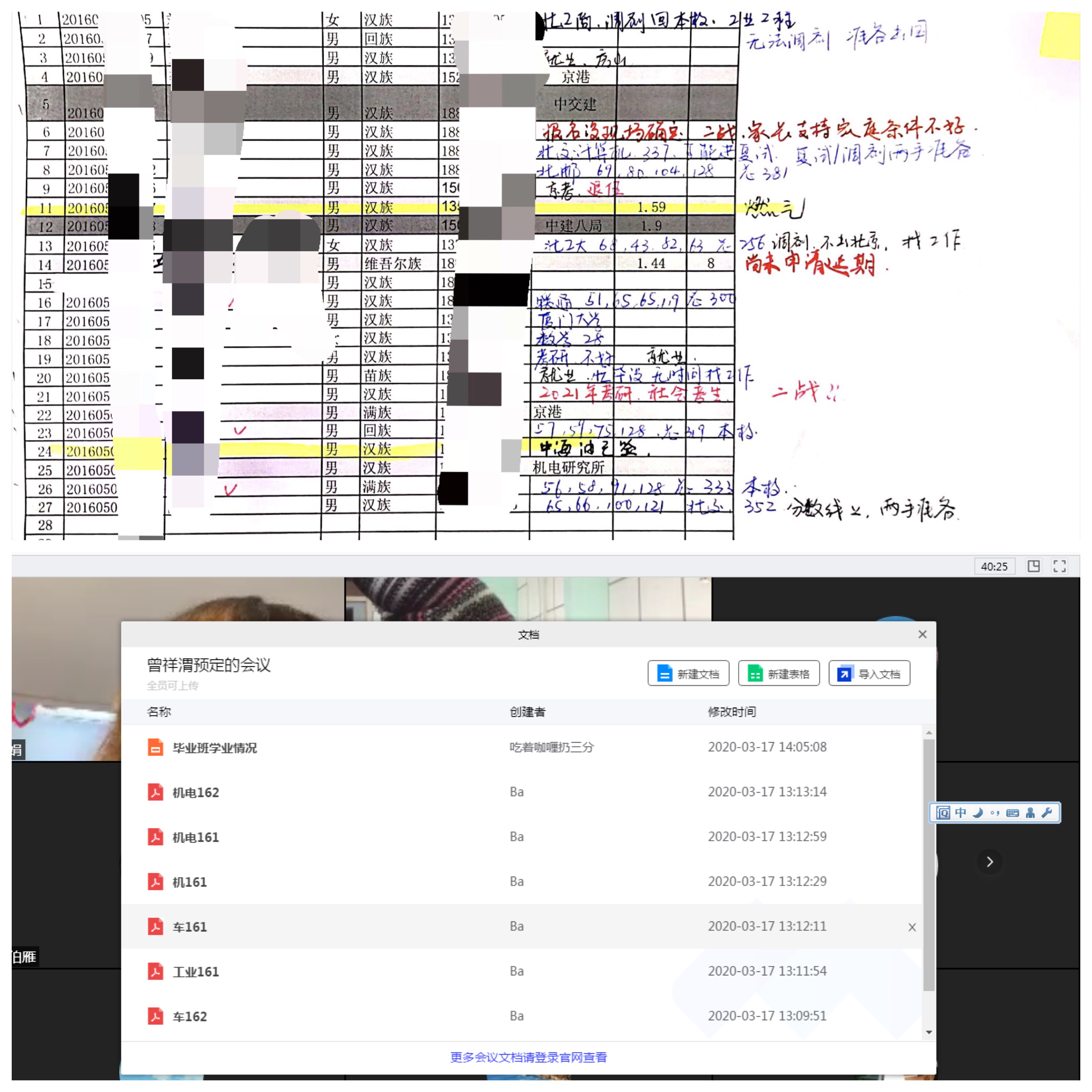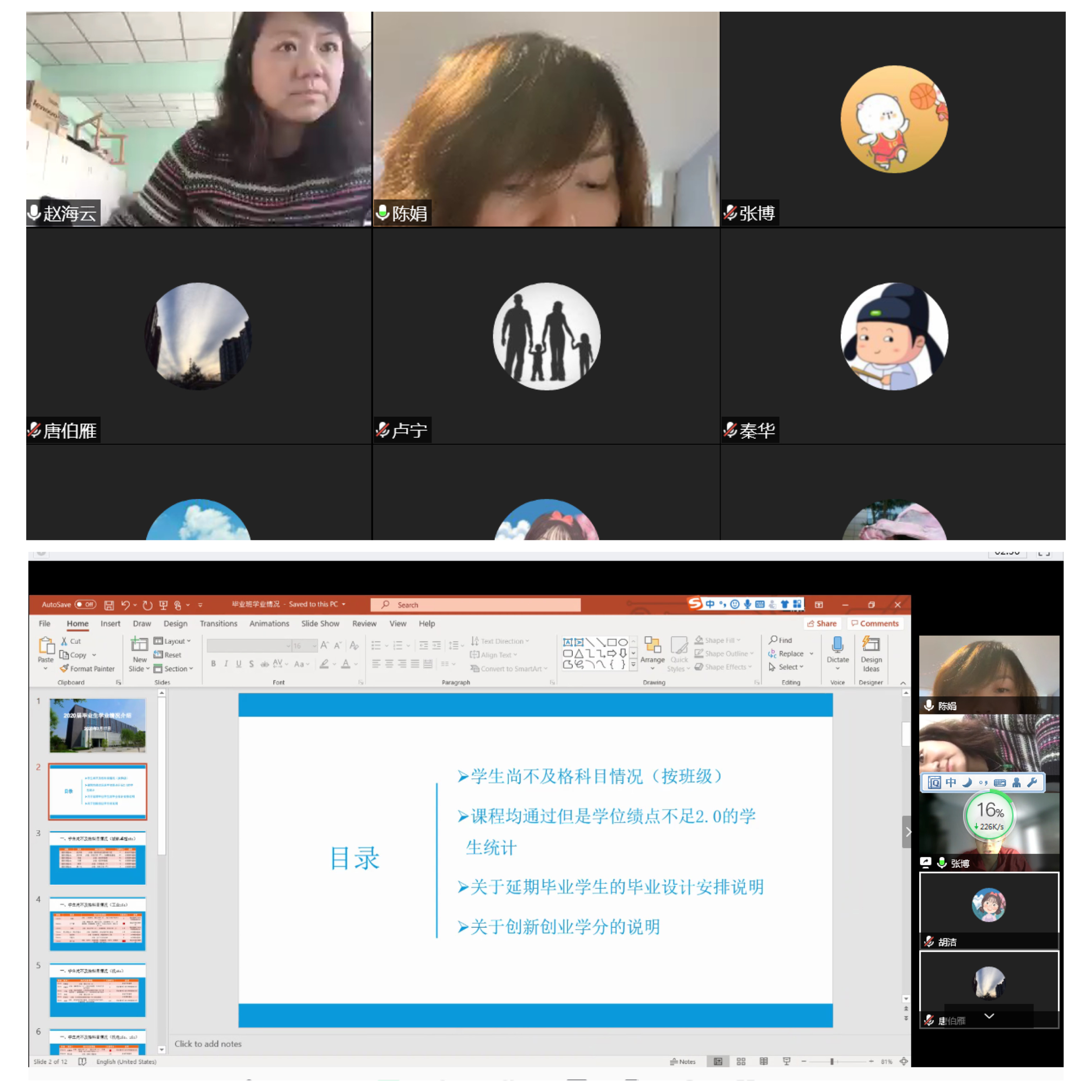 张博分析了2020届毕业生在学业中尚存在的问题,与班主任分析了每一个在学业中存在学业困难的员工,并有针对性此提出了解决办法。胡洁从考研、出国、就业几个方面分析了毕业生就业的整体进展情况,还就学业困难员工、少数民族员工和专升本员工等特殊群体的情况进行了分析。