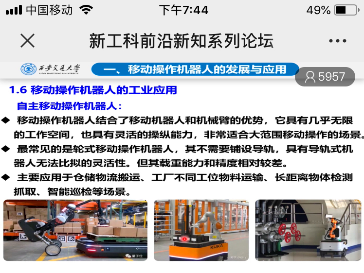 梅雪松教授的讲座从基础概念出发,分别结合移动操作机器人的进化发展、关键技术、在疫情防控中的应用三个方面展开讲述。从概念的提出到发展至今,机器人技术不断进步,已能够实现自主移动操作。目前,机器人的工业应用场景逐渐丰富,在高温环境能做到24小时不间断勘察、进行文件档案存取、物料传送、道路检查等需求条件下都大有可为。梅雪松教授简要分析了移动操作机器人的SLAM导航、地图构建、路径规划以及视觉引导的物体抓取、柔顺控制等关键技术,并指出技术优势以及难点。结合疫情防控,梅雪松教授从工作原理角度介绍了体温筛查机器人、无人消杀巡查机器人等十余种应用于抗疫一线的机器人,并在此基础上讲述了移动机器人的未来发展方向——从自动化应用走向智能化服务,进一步引发深刻思考。