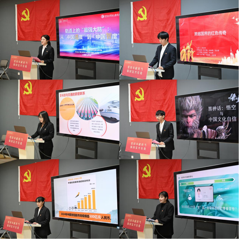 齐之见以《轨道上的最强大脑——从中国速度到中国智度》为题,讲述中国高铁从“跟跑”到“领跑”的跨越,彰显“自力更生、艰苦奋斗”的红色精神;陈旨恒通过《跨越国界的红色传奇》,阐释中国共产党为世界贡献的中国智慧,展现国际视野下的红色担当;吴俊结合实习在《从实习中感受科技强国》中呼吁青年将个人成长融入国家需求;陈浩宇以游戏《黑神话:悟空与中国文化自信》为切入点,展现新时代青年的文化自信锋芒;刘媛媛解析《微短剧爆火背后的文化传播密码》,探讨新媒体时代文化传播的创新路径;公鑫分享比亚迪一线实践经历,展现青年党员扎根一线的思想深度与行动自觉。