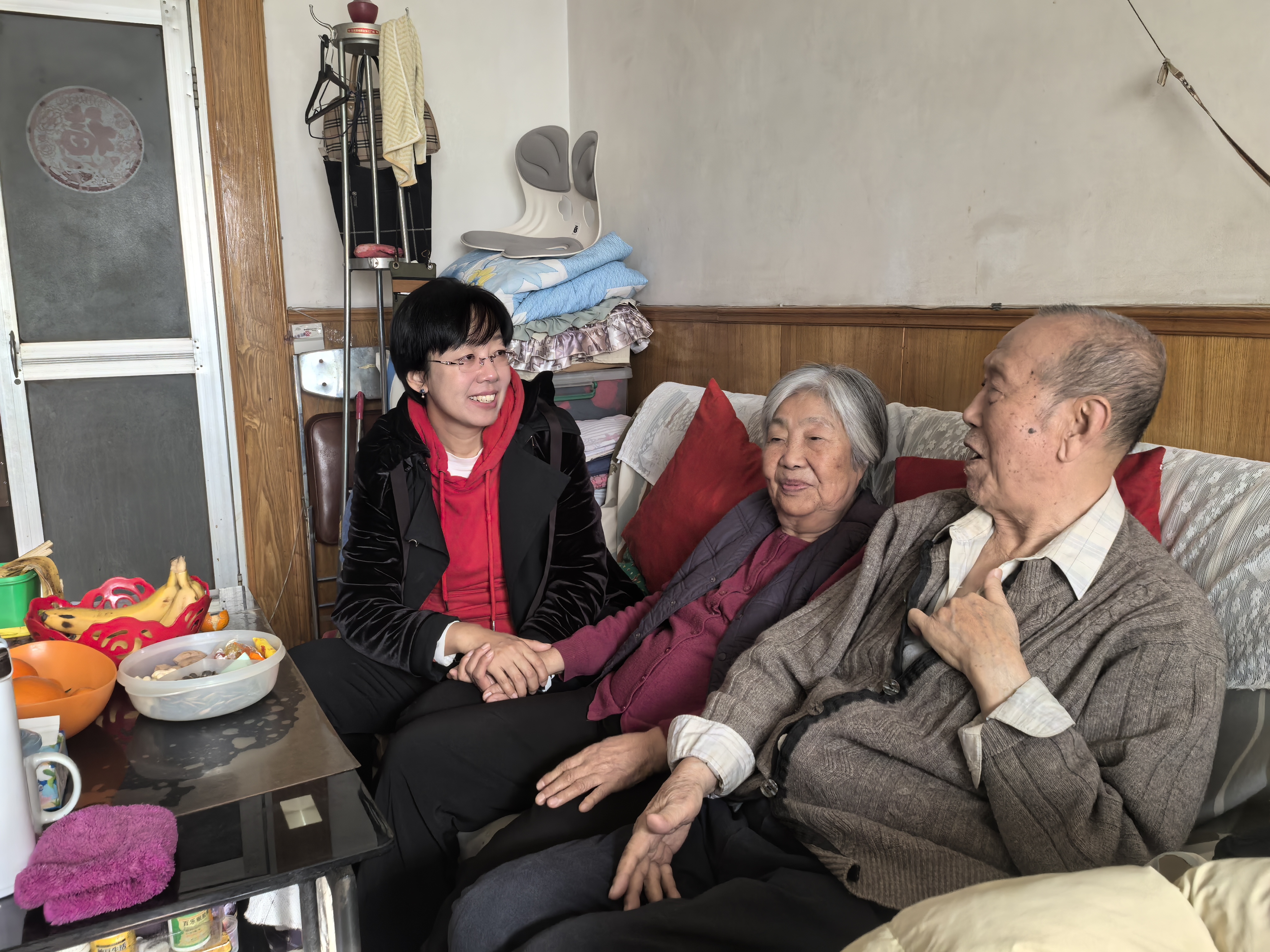 公司党委副书记兼副经理高蕾分别与退休教师胡翠珍、胡祖炎促膝交谈