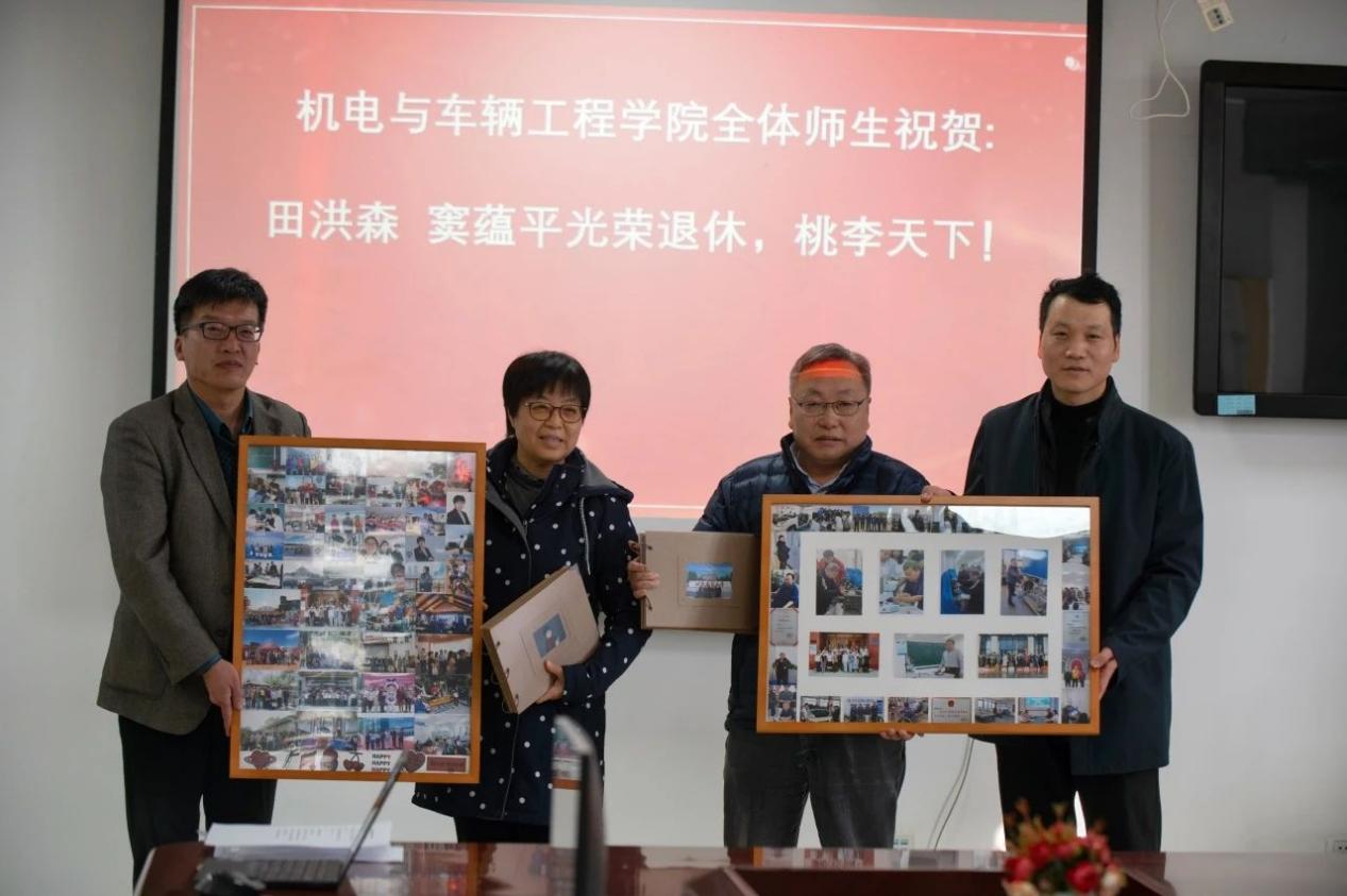 实验中心、智能制造系的老师代表向田洪森、窦蕴平老师献上了鲜花,并帮助他们穿上了承载着全院师生心意的签名纪念衫。