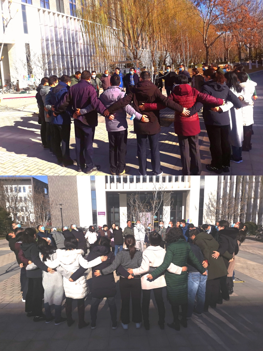 热身环节:全体教工彼此连接围成一个大圈,左右侧伸展,左右兼顾就像我们平日的状态,左边是我们的家庭和生活,右边是我们的学习和工作,每个人都那么忙碌又那么重要,幸好我们身边有同事的帮助和支持,我们才得以挺立不倒。除了外在力量能给予我们支持,我们还要学会自我调节,接下来我们做身体前倾运动,让自己保持安静收敛,我们要在独处中享受安静,让身心收敛不熬夜。我们身体后仰敞开而舒展,我们通过运动舒展肢体,我们通过交流敞开心扉。