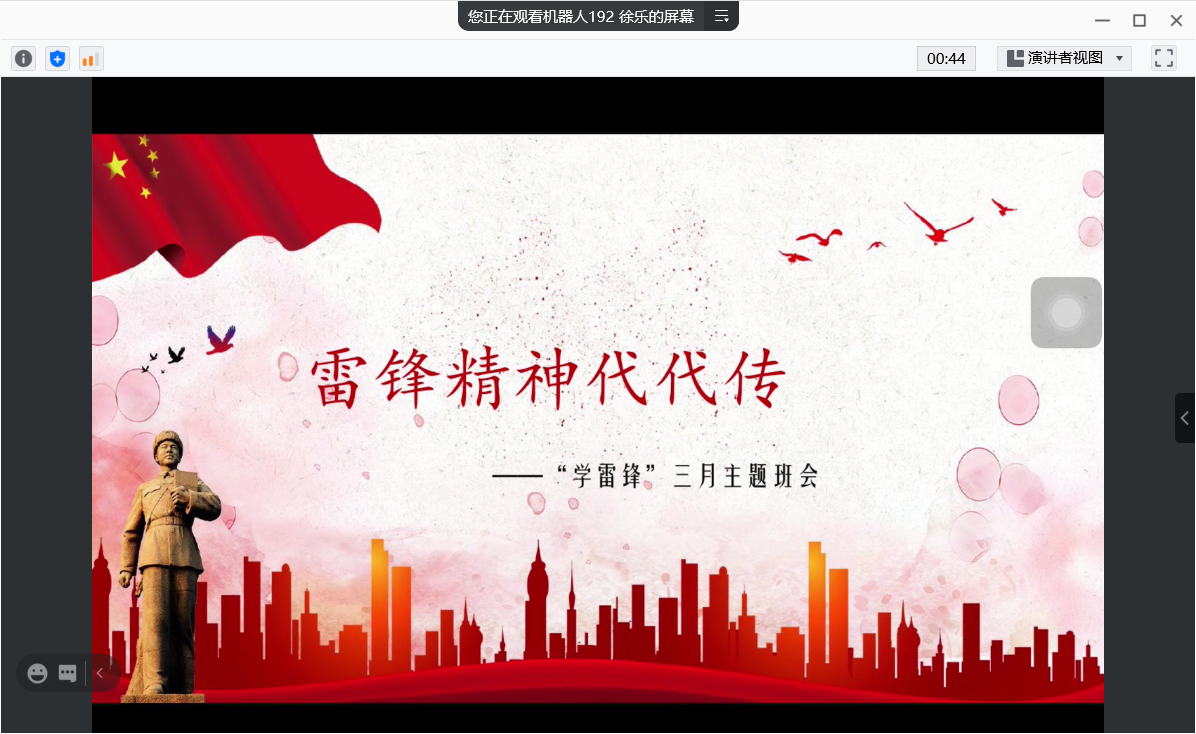 各团支部多形式、多角度开展雷锋精神学习,组织团员青年广泛参与志愿服务活动,锤炼意志品格,以实际行动来传承志愿服务精神。城轨171班共同交流寒假期间参与社区卫生打扫、垃圾分类指引等志愿服务经历;机器人192班解读雷锋精神内涵,并赋予其新的时代意义;城轨201班学习了《雷锋日记》中的三段文字,展示了多项赛事活动中青年志愿者的精彩表现。