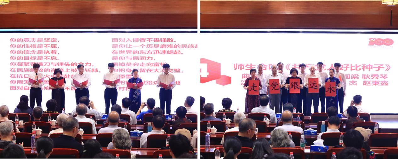 师生党员代表共同带来诗朗诵《我爱你——党旗》、合唱《共产党人好比种子》,传唱红色经典,寻迹红色记忆,传承红色精神。