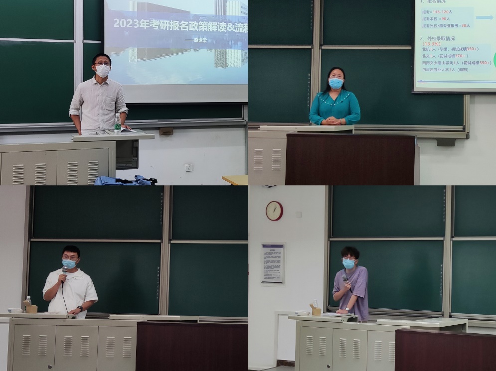会上,硕研2022级张家炜分享了考研备考的经验与方法,从择校技巧、各科复习安排等方面,解读了考研过程中的学习、生活、心理的调整策略。研究生国奖获得者张峻瑞结合自身读研经历,从学习科研、工作实习等方面与大家分享了读研的心得与体会。与会同学们围绕考研备考复习、报考院校等方面展开提问交流。