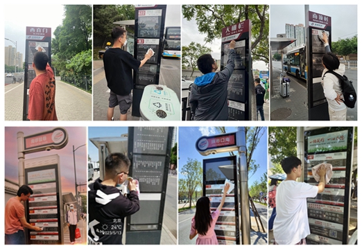 深入公交站点,同学们分批次前往20余个公交站点,对相应站点站牌的种类进行实地考察,并认真开展站牌清理工作。员工志愿者带着小铲子、小毛巾清理公交站牌上的污渍,打造清新整洁的站台环境,在躬行实践中感受劳动的魅力。