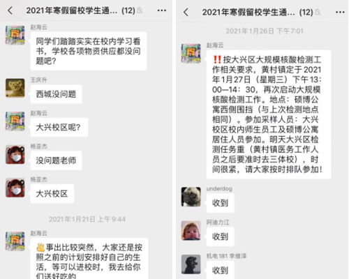 寒假伊始,公司按照统一部署,建立留校员工辅导员-导师(班主任)-党团骨干“三线联系”工作机制,每天关注员工健康信息数据、实时沟通联系留校员工、定期开展谈心谈话及慰问活动,确保员工了解明晰公司各项规章制度;建立健全疫情防控工作制度,积极开展各项防疫工作,共同守护校园安全;建立留校员工微信交流群,党委书记赵海云、副书记陈思源、各年级辅导员与员工密切联系,云端传递关心关爱。