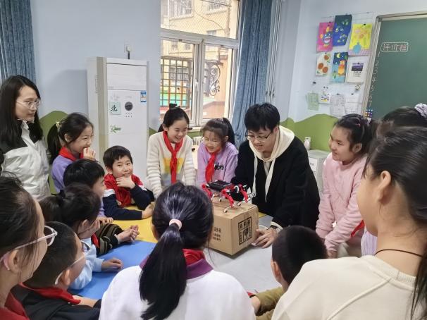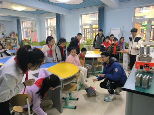来自机器人工程系的机研222班谢子健同学带来了自己的科研作品“机器狗”,向同学们介绍了什么是机器人,现实中的机器人都有哪些,并现场演示机器狗的运动功能和自平衡功能。小同学们非常感兴趣,围成一圈尝试操作,并踊跃提问。有小同学问到:“做这样一只机器狗,编程需要编多久?”谢子健非常详细地解答了同学们的提问。