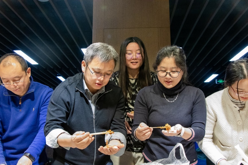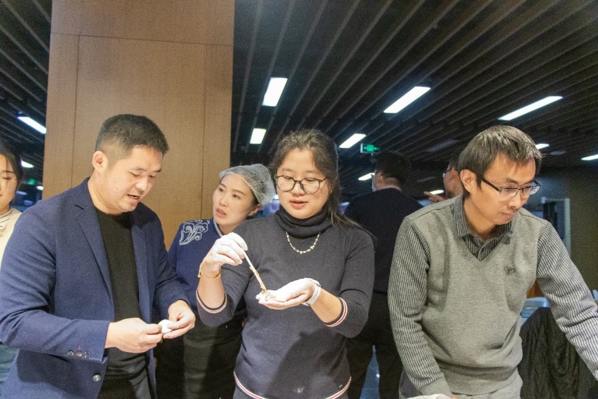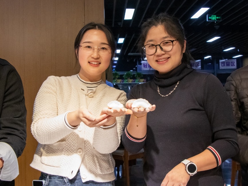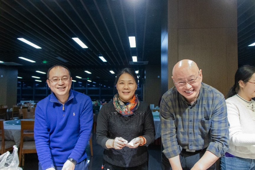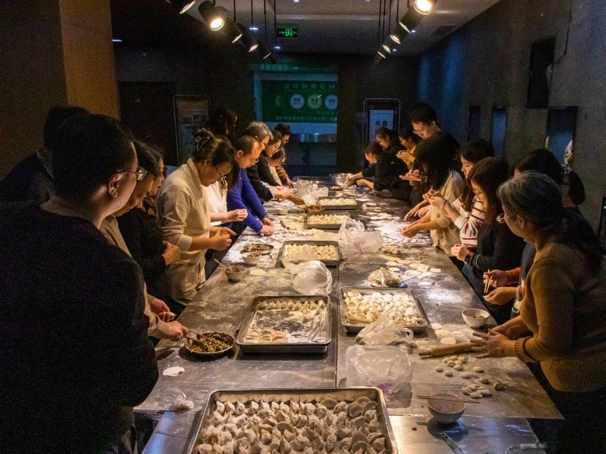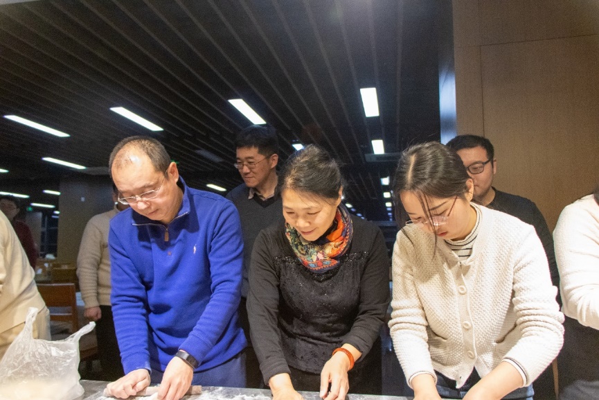 精彩的节目表演后,全体师生一起包饺子,其乐融融,一张张饺子皮和一团团馅料在老师同学们手里变成一个个白白胖胖的饺子,过程中,大家互相帮助,场面十分热闹。