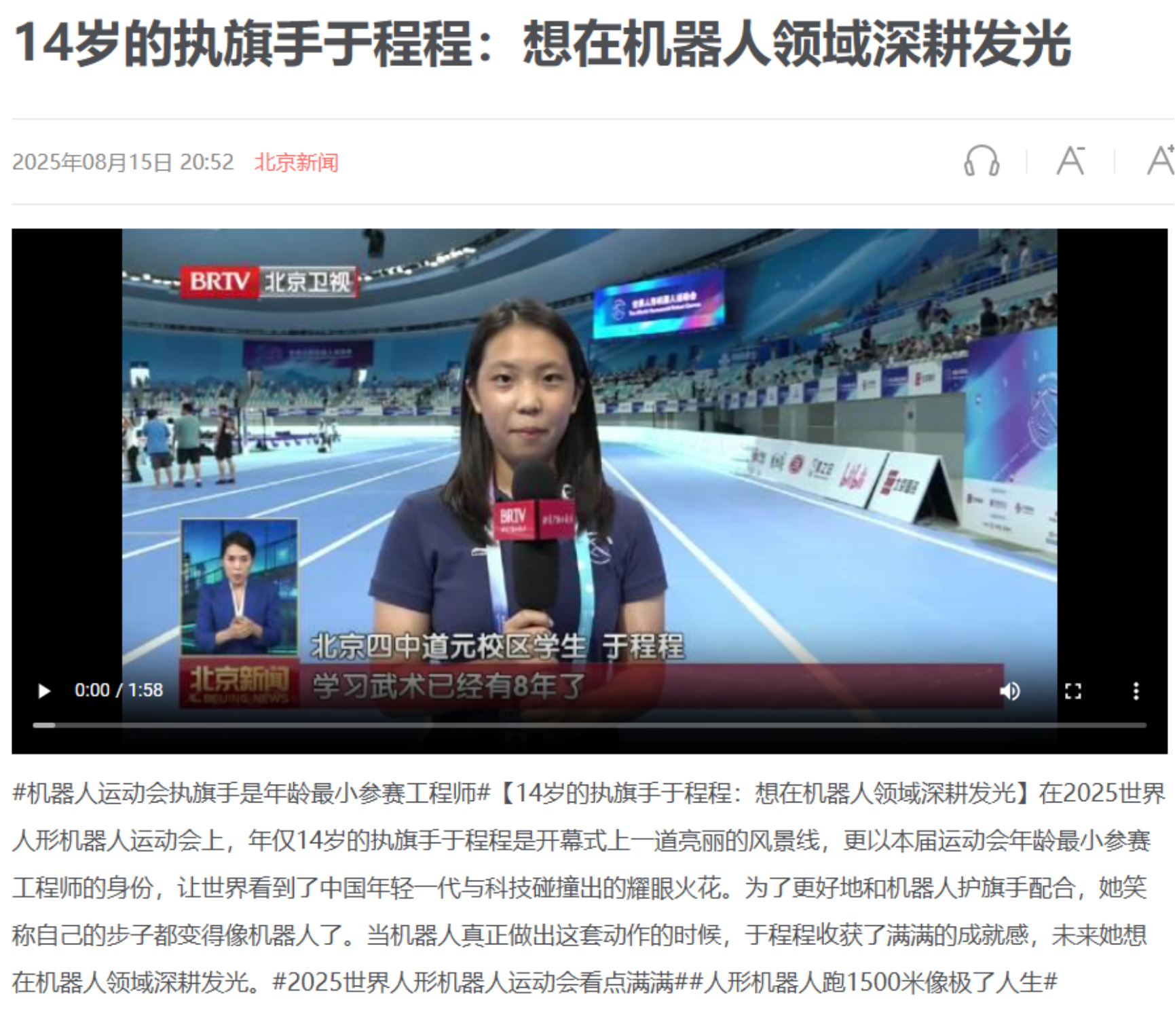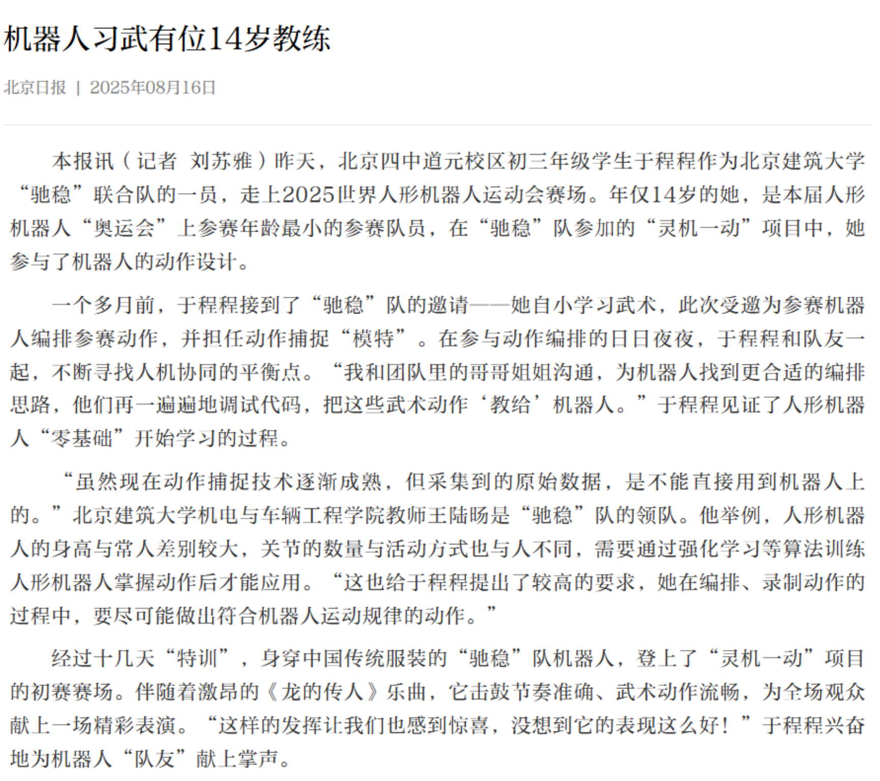 在8月14日晚举行的运动会开幕式上,执旗手于程程成为全场关注的焦点,14岁的她是本届运动会年龄最小的参赛工程师,开幕式后,于程程在接受北京日报等媒体的采访时表示,她一个多月前接到了北建大“驰稳”队的邀请——她自小学习武术,此次受邀为参赛机器人编排参赛动作,并担任动作捕捉“模特”,在参与动作编排的日日夜夜,于程程和队友一起,不断寻找人机协同的平衡点。“我和团队里的哥哥姐姐沟通,为机器人找到更合适的编排思路,他们再一遍遍地调试代码,把这些武术动作‘教给’机器人。”于程程见证了人形机器人“零基础”开始学习的过程。作为“驰稳队”灵机一动赛项的运动员,8月15日下午她与其他队员一起参加了当天下午的比赛。