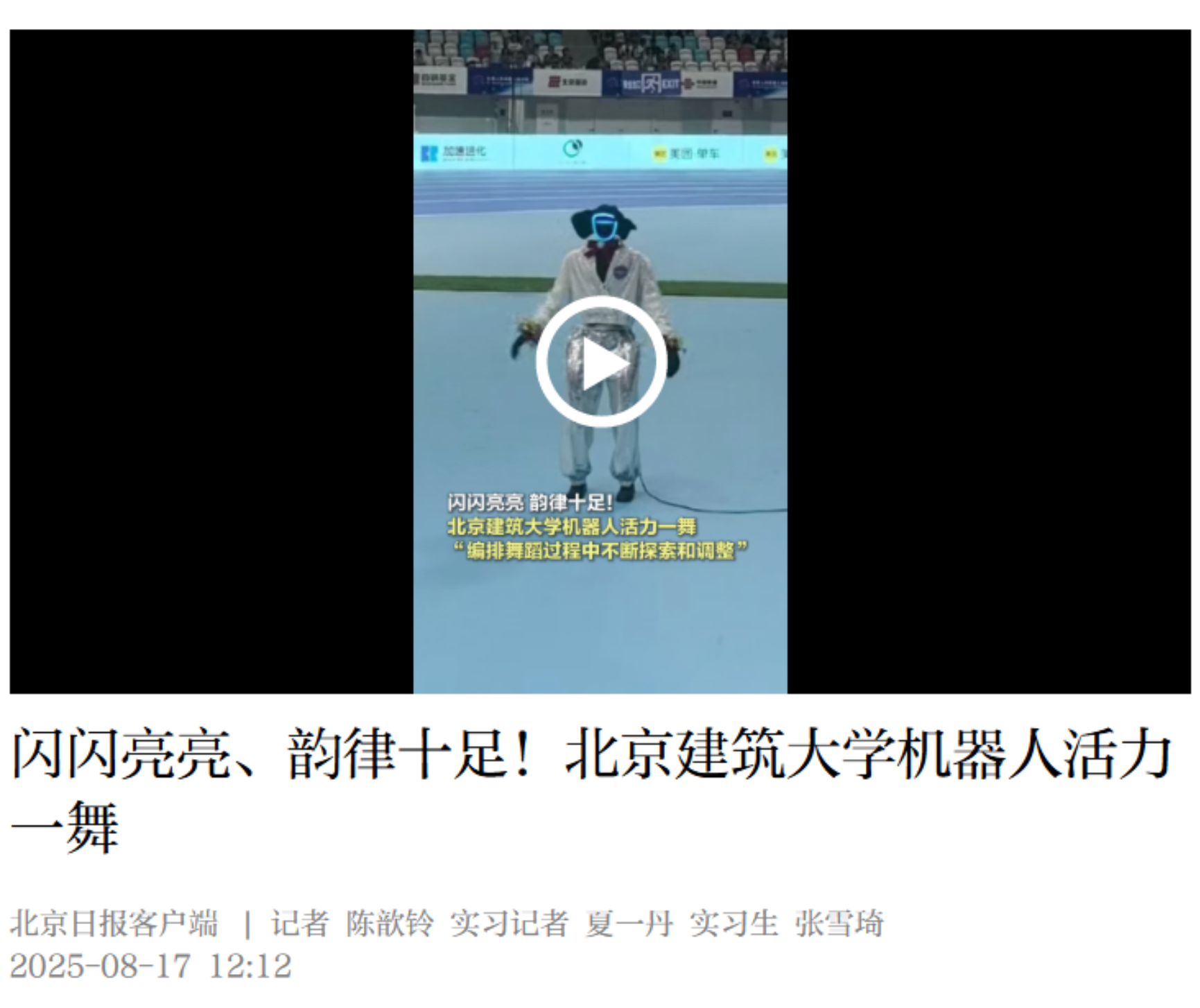 针对单机舞蹈赛项,“驰稳”机器人舞蹈队与合作单位元客视觉提出了从光学动作捕捉到强化学习多策略舞蹈动作部署的技术路线。李金老师将体育艺术与科技创新理念巧妙融合,创作灵感源于当代青年对自信之美的多元表达,通过富有节奏感的肢体语言与音乐旋律的紧密契合,将流行舞蹈的活力与机器人的机械精准度巧妙结合,旨在传递“科技与艺术共塑魅力”的创作主旨。每天参赛团队针对机器人关节灵活性、动作连贯性、人-机动作映射等关键问题进行技术攻关,夜间孙旭华老师带领的智算中心团队保障机器人学习任务的及时完成,最终使机器人在舞台上精准复现了编排中的移动、wave等细节动作,展现出媲美人类舞者的流畅姿态。最终在21支决赛队伍中取得第9名的成绩。比赛过程中,北京日报等媒体对李金老师进行了专访。