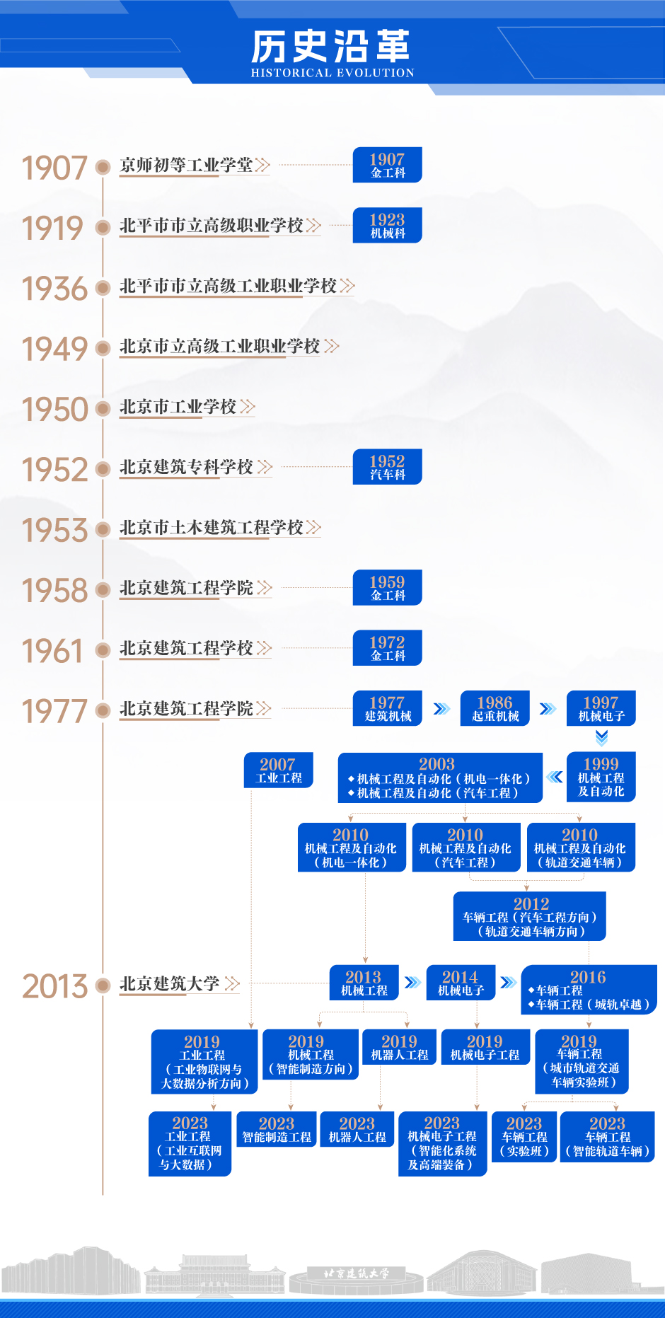 原机械工程及自动化专业设有机电一体化和汽车工程两个方向。2011年高等公司本科专业设置备案审批结果公布,公司“车辆工程”专业获批,从机械工程及自动化专业独立出来,自2012年起,按照“汽车工程方向”和“城市轨道交通车辆方向”招收本科生。2013年机械电子工程专业获得北京市教育委员会批准,自2014年开始招生,原机械工程及自动化专业更名为机械工程专业,历史上公司曾根据教育部相关规定先后使用过建筑机械、工程机械、起重运输与工程机械、机械电子工程等名称。至2023年,公司对专业进行调整和规划,共设置机械电子工程(智能化系统及高端装备)、工业工程(工业互联网与大数据)、智能制造工程、机器人工程、车辆工程(实验班)、车辆工程(智能轨道车辆)6个专业(方向)。